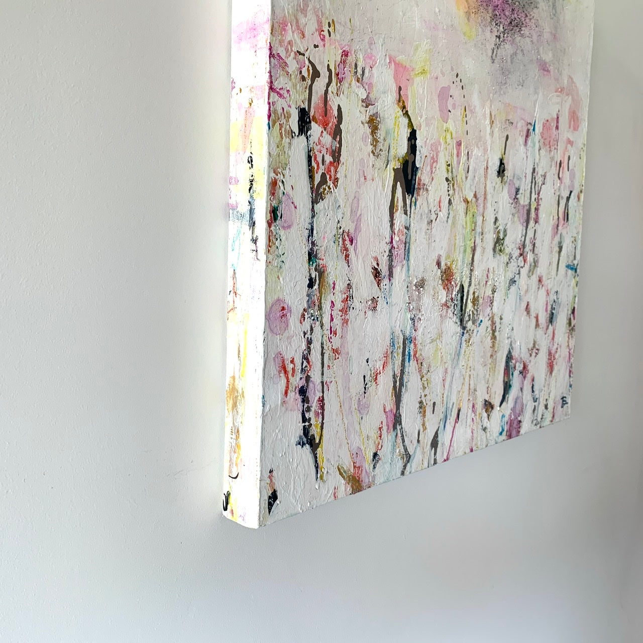 An original mixed media painting with heavily textured acrylics, oil pastels, and alcohol ink on canvas. The painting continues on the sides of the canvas.
