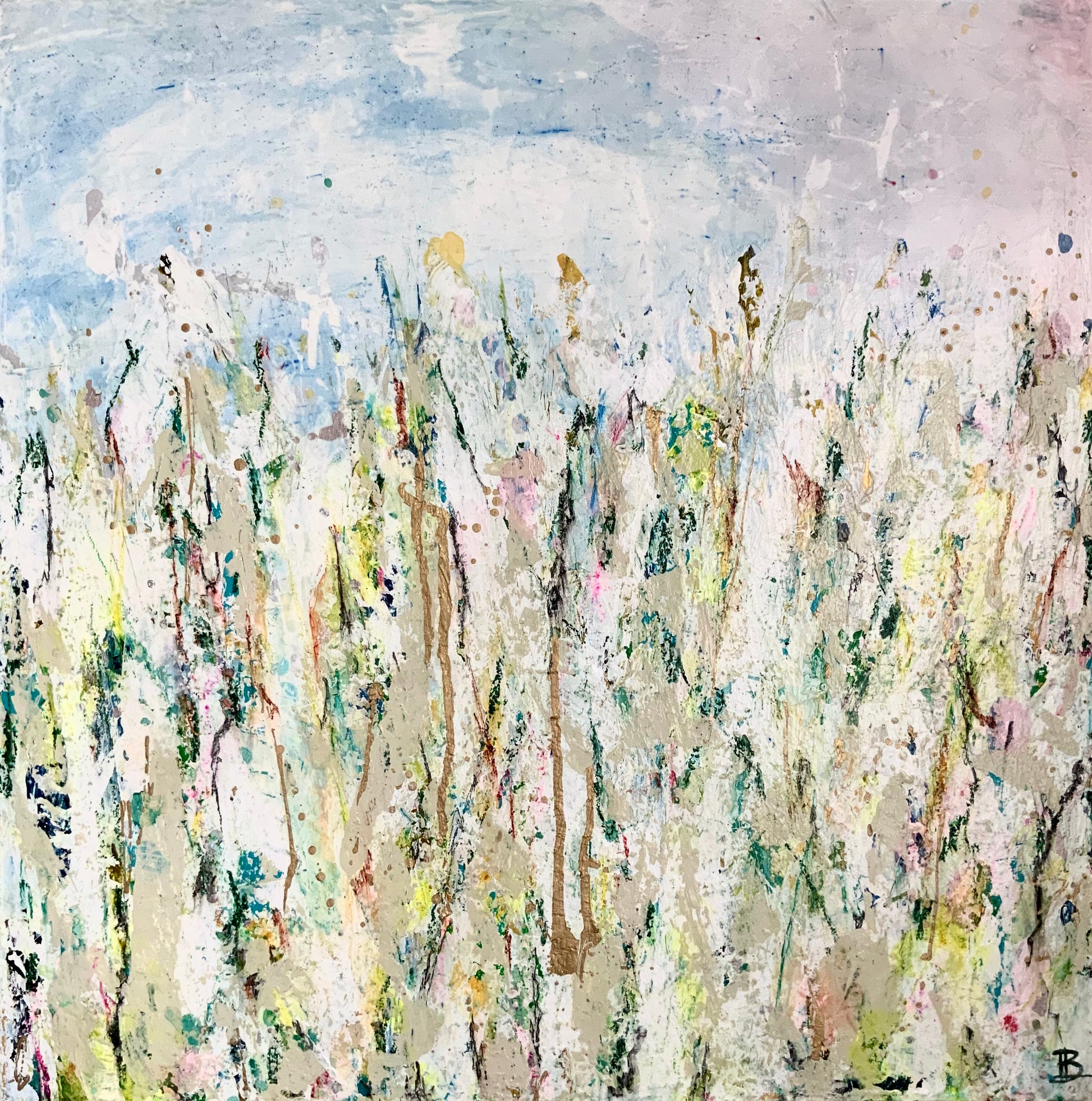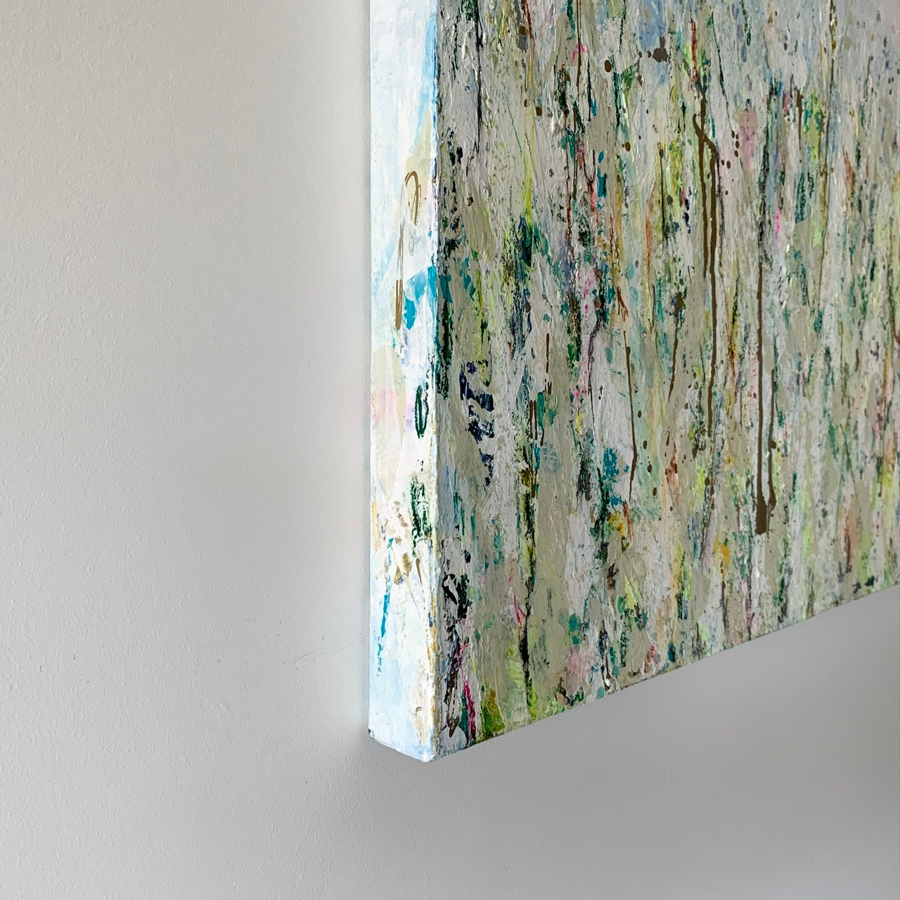 An original mixed media painting with heavily textured acrylics, oil pastels, and alcohol ink on canvas. The painting continues on the sides of the canvas.