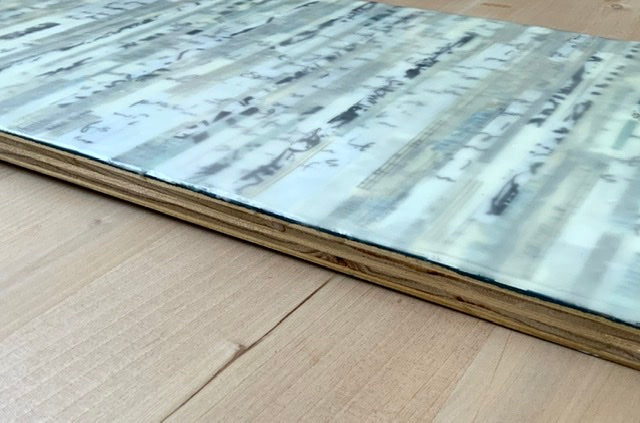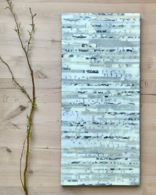 This original mixed media artwork on a raw-edged piece of baltic birch is a unique blend of paper and wax. A collage was created with strips of vintage sheet music, screen printed handwritten text, maps, and abstract ink artworks. The collage is coated with smooth layers of encaustic (beeswax) medium, giving this piece a rich depth and natural beauty.