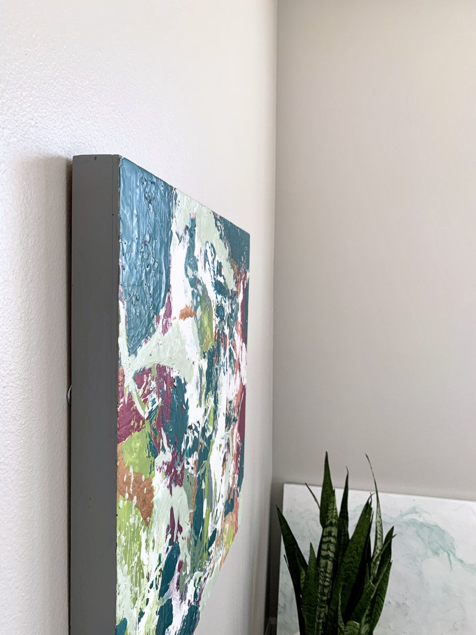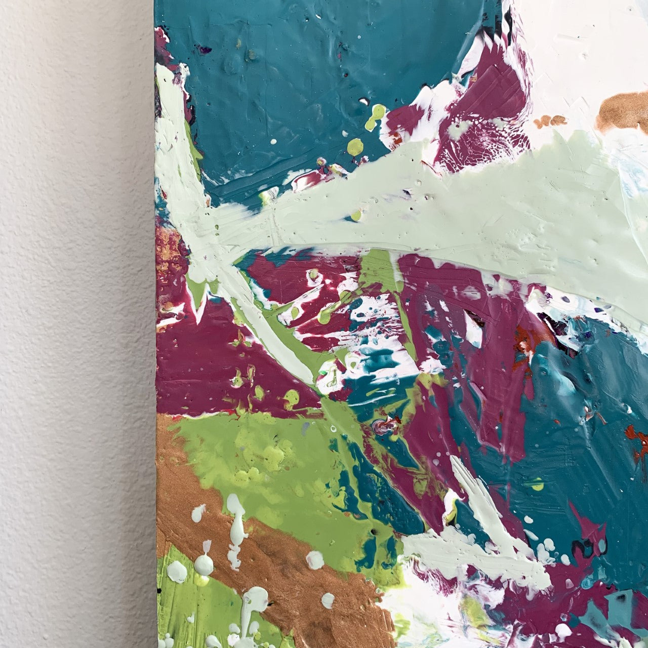 This dimensional original encaustic (beeswax) painting is incredibly vibrant, featuring teal and magenta. It is heavily textured, and has a polished finish. The wax painting is on a birch front panel with dark grey painted pine sides.